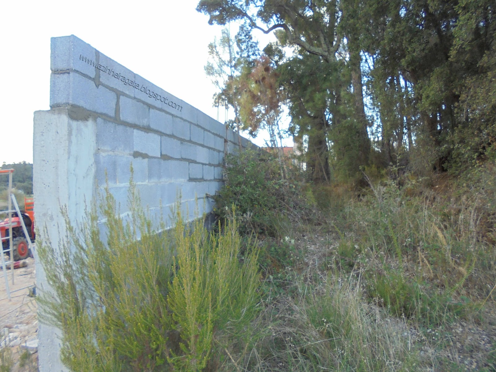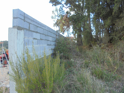 É o caso desta primeira situação, onde se vê um recente muro de blocos de cimento a assinalar os limites de um terreno. Quero, posso e mando, é a típica mentalidade que leva a este tipo de situações. Para ajudar, os regulamentos camarários permitem este tipo de obras de mau gosto. Será que havia necessidade de tal mamarracho para marcar o limite de uma propriedade qualquer? Será que uns postes de madeira com uns arames não ficavam melhor enquadrados? E mesmo esta última hipótese, faz sequer falta? Mas afinal porque é que temos a mania de mandar construir muros desta forma? Absurdo...